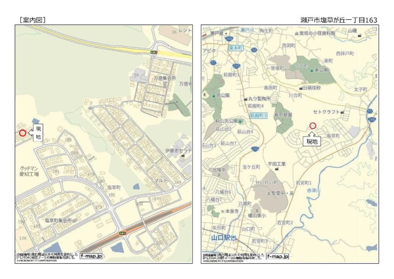 ※地図上の「対象地」は「愛知県瀬戸市塩草が丘1丁目 」付近を示しています。実際の場所ではない場合がございます。詳しくはお問い合わせください。