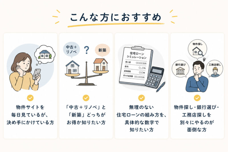 「自分に合う物件が分からない」「予算が不安」「リノベって高そう」
