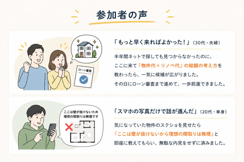 半年間ネットで探しても見つからなかったのに、ここに来て『物件代+リノベ代』の総額の考え方を教わったら、一気に候補が広がりました。その日にローン審査まで進めて、一歩前進できました。