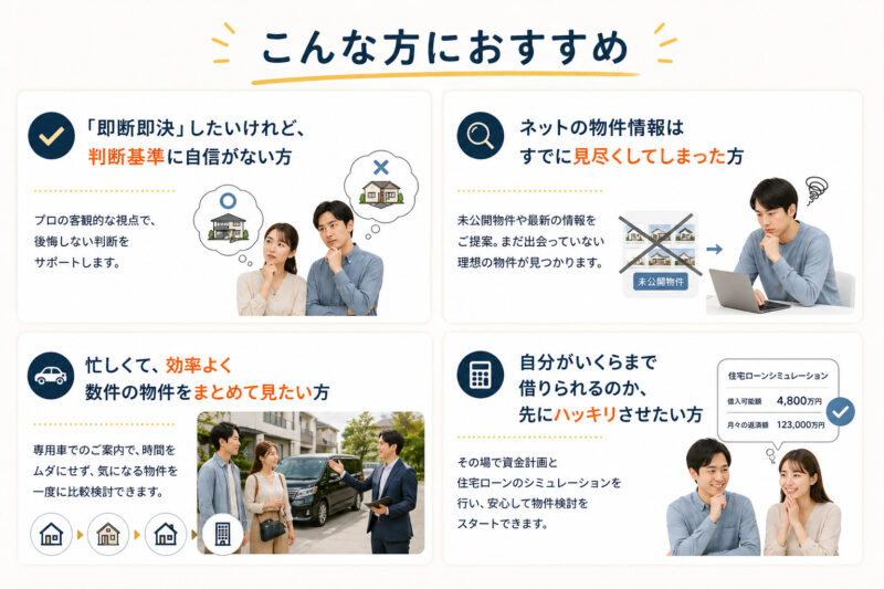 物件探しから資金計画、ローンの相談まで、バラバラに動く手間をカット。1日で家探しのフェーズが数段階進みます。