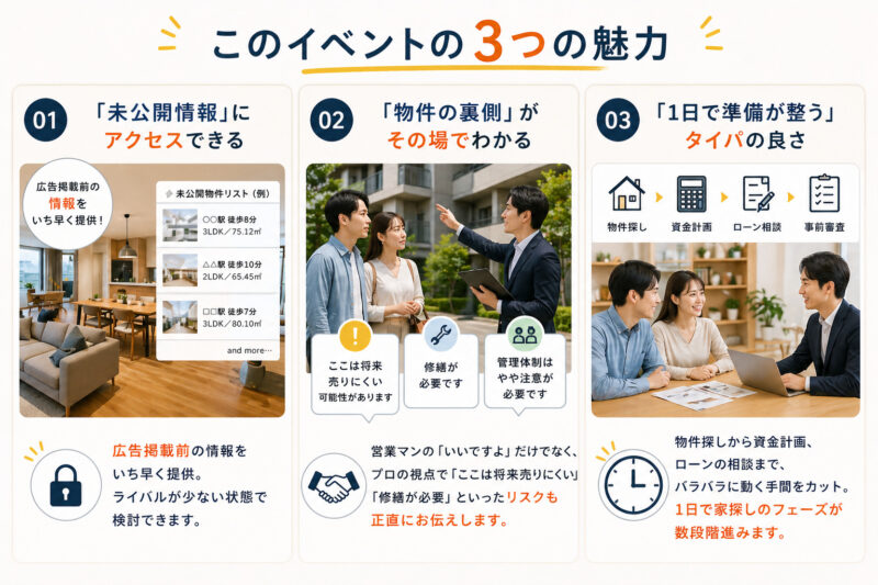 「SUUMOやホームズを毎日見ているのに、いい物件が見つからない…」 それもそのはず、本当に条件の良い物件は、ネットに載る前に決まってしまうことが多いからです。 本イベントでは、不動産業界のネットワークを駆使した「未公開物件」の紹介と、プロの目利きによる物件案内を1日で体験いただけます。