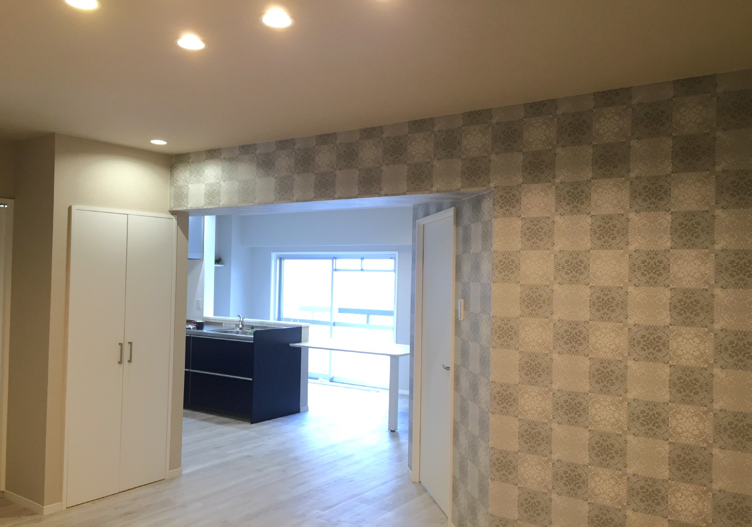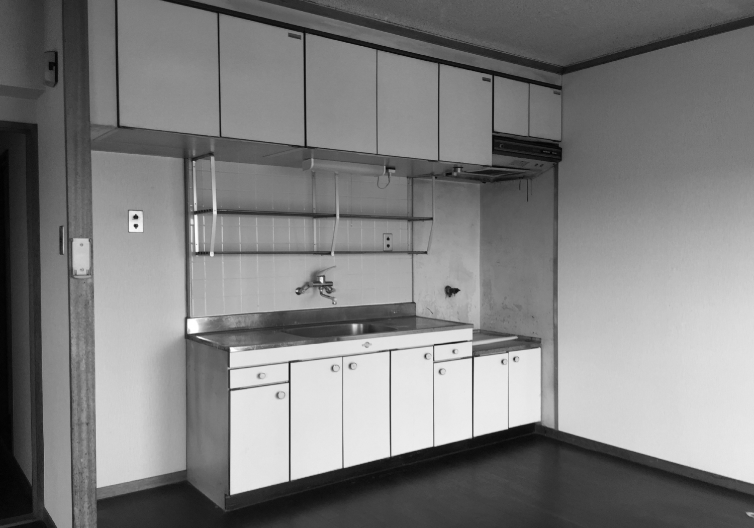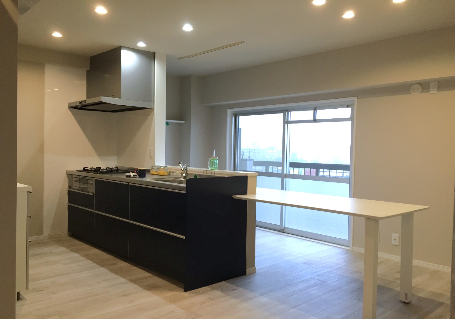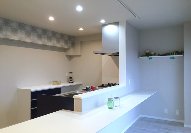 水廻り4点交換、給湯器交換、天井・壁クロス貼替、床張替、ダイニングテーブル造作、建具交換、クリーニング